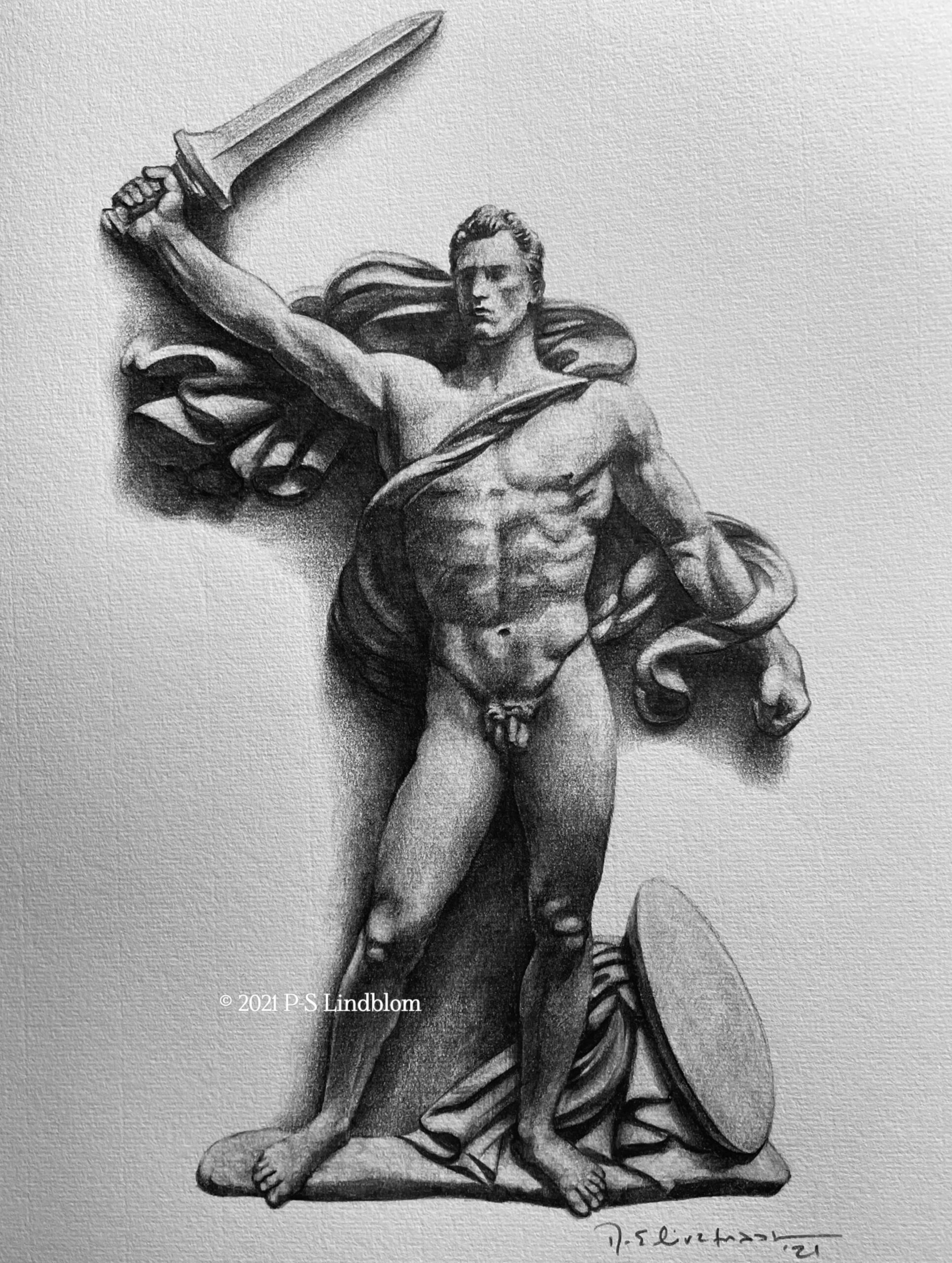 A pencil drawing of Arno Breker’s relief Victorious Warrior / Siegreicher Krieger.
